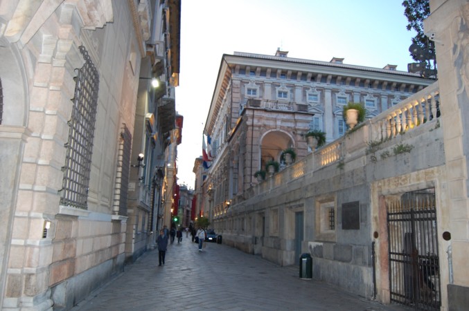 Principaux palais, depuis la Piazza delle Fontane Marose en direction de la Piazza della Meridiana : Palazzo Pallavicini Cambiaso, Palazzo Pantaleo Spinola (ou Palazzo Gambaro), Palazzo Lercari Parodi, Palazzo Carrega Cataldi, Palazzo Doria, Palazzo Podestà, Palazzo Cattaneo Adorno, Palazzo Doria Tursi, Palazzo Campanella, Palazzo delle Torrette, Palazzo Rosso & Palazzo Bianco.
